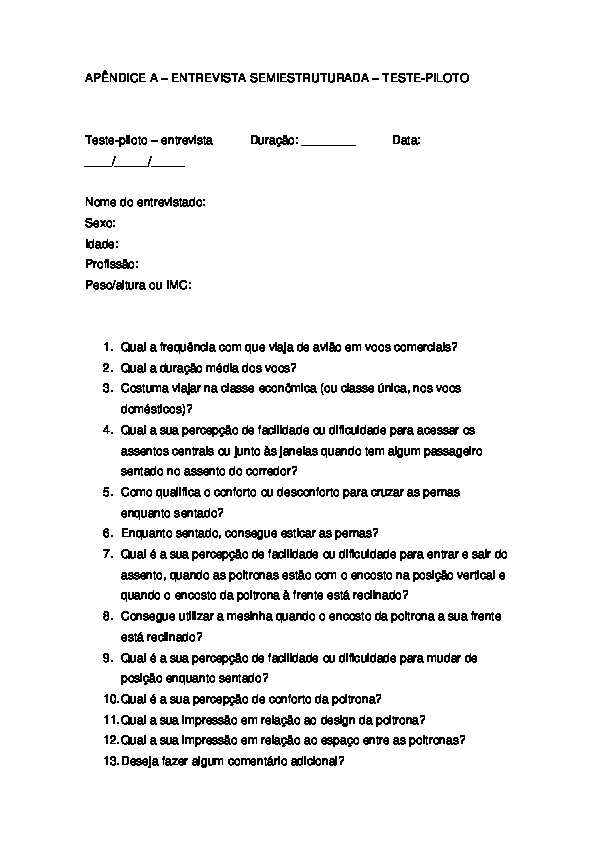 Os passageiros têm reclamado da diminuição do conforto na classe econômica dos aviões comerciais. A autoridade aeronáutica brasileira instituiu um selo de qualidade, mas as empresas aéreas brasileiras mantêm os mesmos arranjos internos em seus aviões. Estadissertaçãotrata da avaliação do espaço entre as poltronas e a sua influência no conforto dos passageiros em vôos comerciais. Realizaram-se avaliações da usabilidade utilizando-se um simulador de cabine para treinamento de tripulantes e um avião B737-300. Os resultados indicam uma forte relação entre os níveis de conforto e o “passo” (medida de repetição das fileiras de poltronas ao longo do avião).