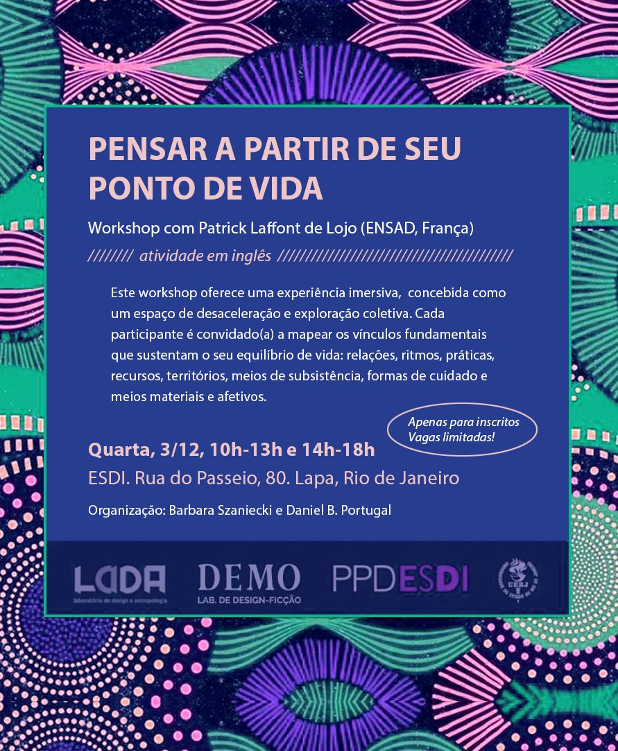 Na quarta-feira, 03/12 e quinta 04/12 haverá dois eventos na ESDI com a participação do Patrick Laffont de Lojo, professor do Ensad, Paris. Os dois são parcerias dos laboratórios Lada e Demo.