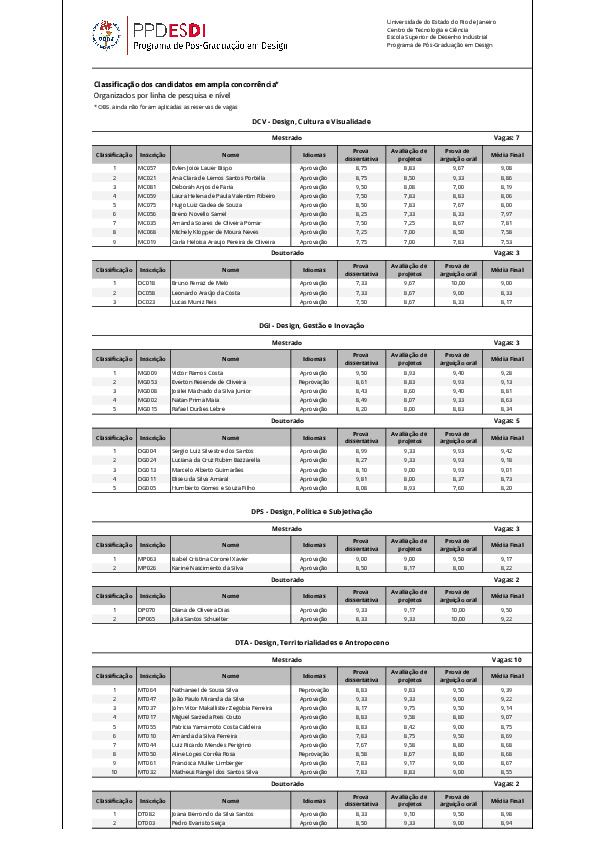 Divulgação do resultado dos recursos Arguição Oral, resultado final da Arguição Oral e Classificação por linha de pesquisa em ampla concorrência. notas da prova de arguição oral para o processo seletivo 2025/2026 do PPDESDI.